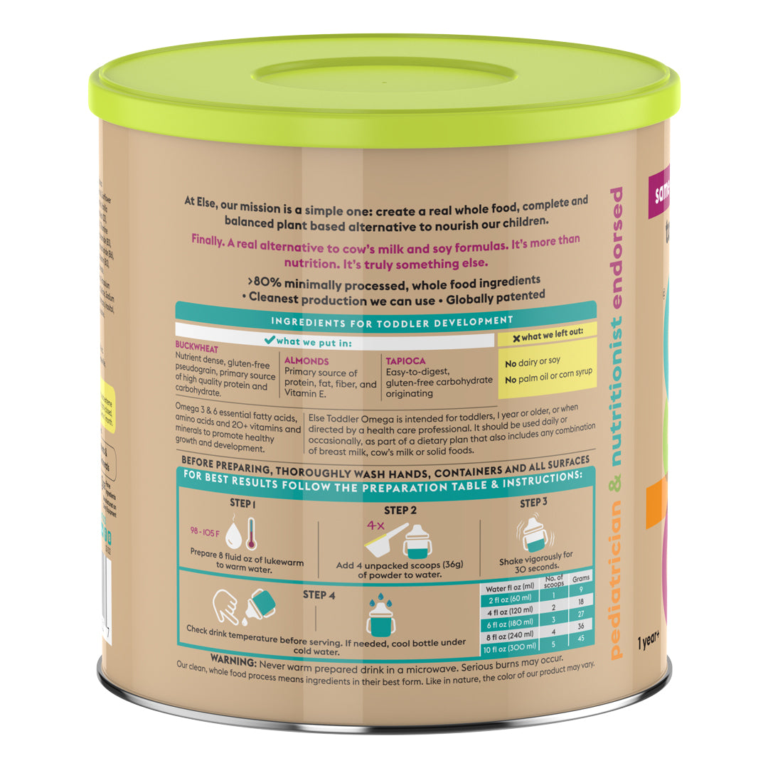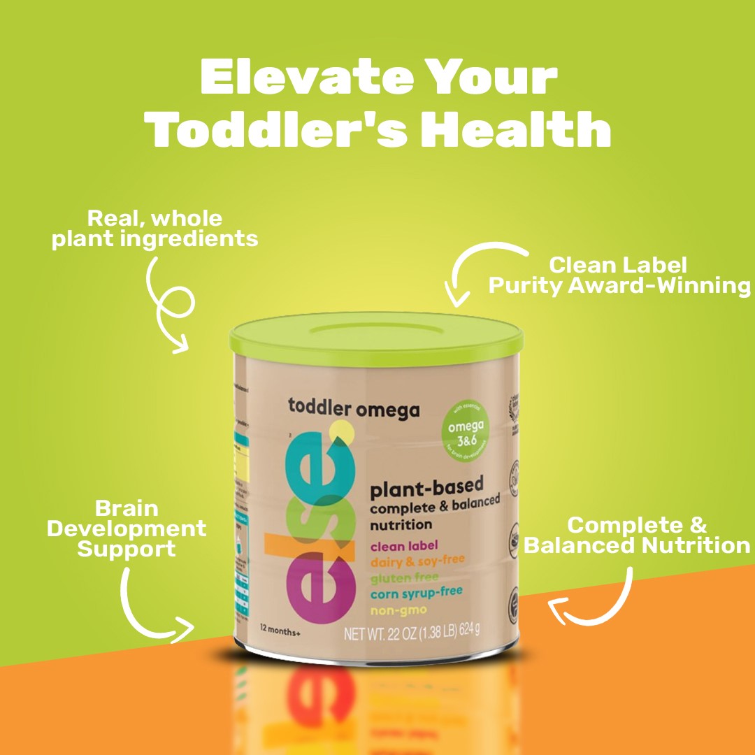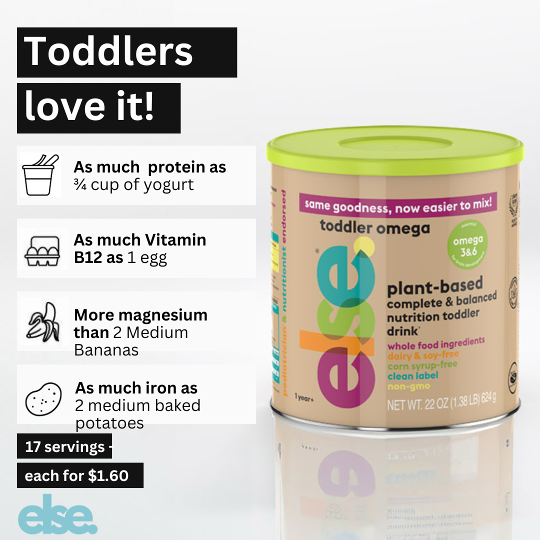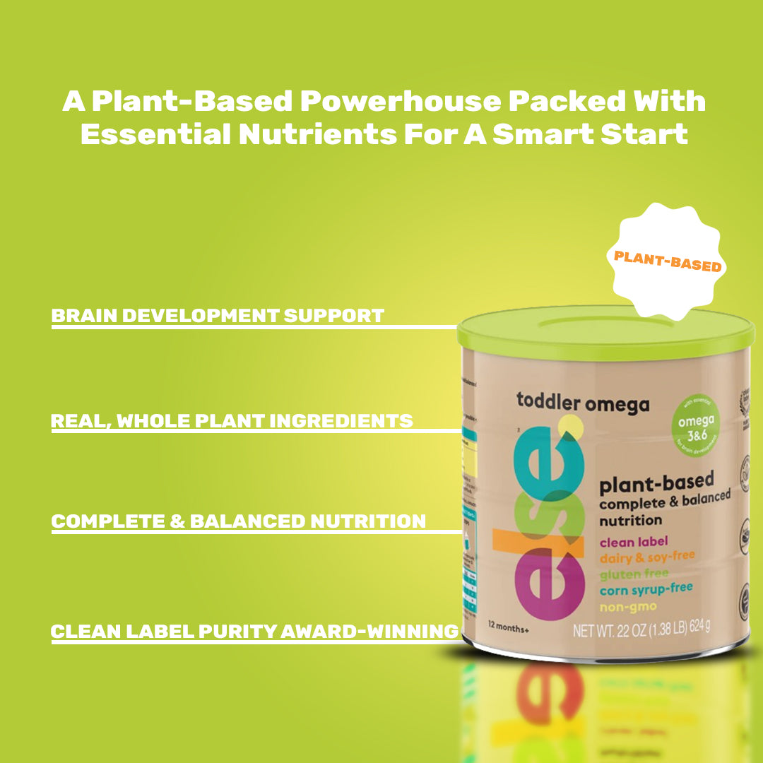 Give your toddler the smart start! lean Label Project certified, plant-based, complete & balanced nutrition for beyond the first year. A real alternative to cow’s milk and soy formulas that gives you a real choice besides dairy. Made with 80% minimally processed, whole-food ingredients, Else™ Toddler Omega is our 1st Toddler product with added Omega 3 & 6 fatty acids to support brain development. Nutritionally complete, meaning it contains all macronutrients ((healthy fats, carbs and protein) & 20 essential vitamins and minerals. < Read Less