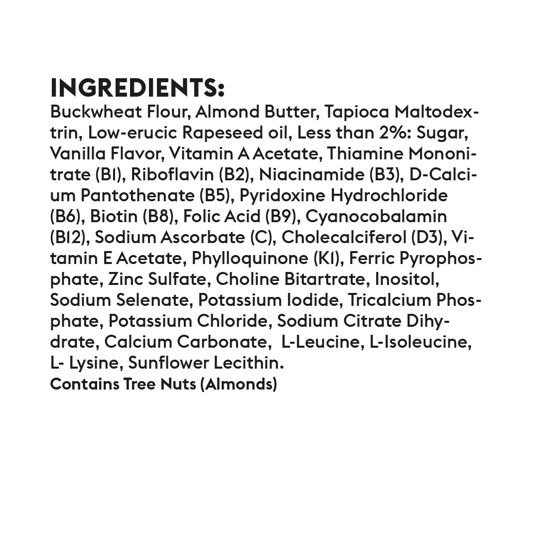 Organic Buckwheat Flour, Almond Butter, Organic Tapioca Maltodextrin, Organic Coconut oil, Organic Rapeseed oil, Organic Sunflower oil, Less than 2% of: Organic Sunflower Lecithin, Organic Vanilla Flavor, Vitamin A Acetate, Cholecalciferol D3, Vitamin E Acetate, Phylloquinone (K1), Thiamine Mononitrate (B1), Riboflavin (B2), Niacinamide (B3), Pantothenic Acid (B5), Pyridoxine Hydrochloride (B6), Biotin (B8), Folic Acid (B9), Cyanocobalamin (B12), Sodium Ascorbate (C), Calcium Carbonate, , Tricalcium Phosphate, Copper Sulfate, Potassium Chloride, Ferric Pyrophosphate, Zinc Sulfate , Sodium Selenite, Sodium Citrate Dihydrate, Choline Bitartrate, Inositol, Taurine, Potassium Iodide, Organic White Cane Sugar, L-Leucine, L-Iso Leucine, L- Lysine