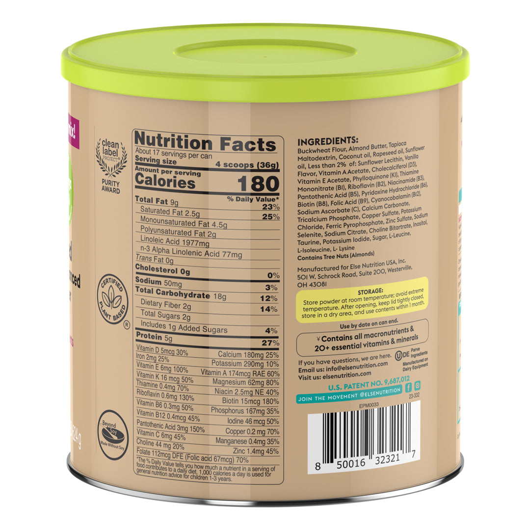 The protein in Else™ Toddler Omega is derived from the combination of almond butter and buckwheat, with addition of free amino acids leucine, isoleucine, and lysine to provide the highest quality plant-based protein we could.