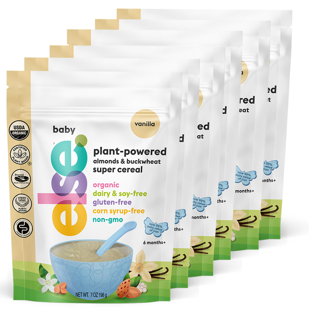 Baby cereals are recommended among the first solid foods to be introduced around 6 months, and at the beginning of the transition from liquid diet of breast milk or infant formula to solid complementary foods. Cereals provide some benefits to the growing nutritional need of infants at that age; they are excellent source of energy when exclusively breastfeeding can no longer supply all the nutritional requirements. Whole-food based cereals as Else super cereal are naturally high in fibers, which contribute to gut microbiota. Inclusion of iron-fortified cereal on a regular basis is an effective way to supply iron at the beginning of complementary feeding, when the infant’s iron stores are depleting. On top of all those, cereals are an excellent choice for transition to solids as they have mild taste with semi-solid texture and consistency.